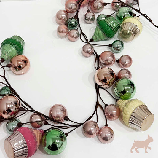 Guirnalda navideña de esferas y cupcakes pastel