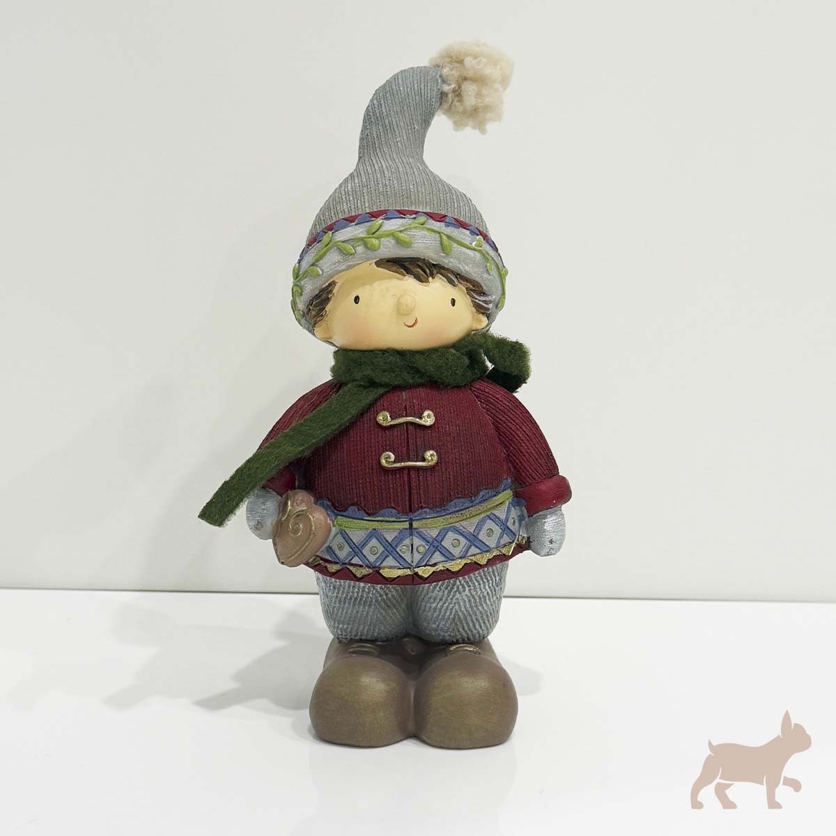 Éste simpático niño navideño transmite alegría y espíritu festivo. Sus acabados detallados y su estilo acogedor lo hacen perfecto para complementar la decoración de la temporada.